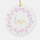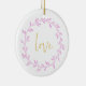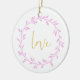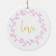 Violet Floral Wreath with Love in Yellow Script Ceramic Ornament