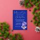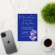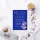 This is a 5' x 7" wedding invitation, shown in royal blue, with floral artwork of violets and pale pink flowers. The invitation has silver foil accents and foil typeface. All foil on the invitation is genuine Italian foil, available in gold, silver, and rose gold. The reverse includes an 'Our Special day' motif, with complimenting ink colours.