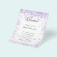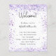 A modern, elegant wedding program, timeline. A white background decorated with violet, lavender coloured faux glitter dust. Personalize and add your names and wedding details. Black coloured letters. If you have more text it's possible to reduce the line space.