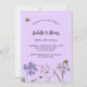 A violet, lavender coloured background. Decorated with bees and painted wildflowers in violet and pink. Personalize and add a name and party details.