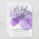 A modern bridal shower invitation with an oversize violet watercolor orchid flower as the main feature, overlaid with the phrase "bridal shower" in sophisticated hand lettered black font, and event details in black in the lower third of the invitation. The back of the invitation is in violet.