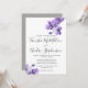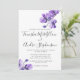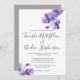 A pretty floral wedding invitation featuring violet watercolor orchids and the names of the bride and groom in dark grey hand lettered font. The reverse of the card is in solid grey.