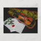 Violin and red rose on black background postcard