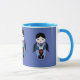 A cute little violin doll on a coffee mug with matching blue handle and interior.