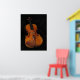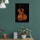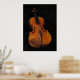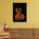 This poster presents a classical still life of an elegant old violin. This graceful instrument is essentially a hollow wooden box with rounded ends, two graceful f holes and a narrow centre. The four sets of strings extend from a string holder at the bottom of the body over a raised bridge to the end of the narrow neck, or fingerboard where the four strings are inserted into a pegbox and are held there with pegs. The pegs are used to tune the violin. When the bow is drawn across the strings on the body of the violin it produces incredible, magical music! The gorgeous golden brown, almost orange tones are set off by graceful black velvet fabric.