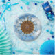 A kaleidoscopic circle of overlapping violins resembles a sunflower and is displayed against a vivid blue sky with fluffy white clouds.