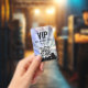 Template with QR code option VIP All Access Custom Concert and Music Festival Badge. Replace with your concert name, location and date. Use this photo or replace with your own.