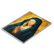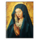 The plain and dark background contrasts with the Virgin's radiant bowed head and the white headdress covering it, and her hands are gently closed together