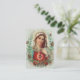 Remember your loved ones in prayer with this beautiful personalized traditional Catholic religious memorial holy card of the Blessed Virgin Mary under the title of the Sorrowful and Immaculate Heart of Mary. The Marian Cross is below her Immaculate heart on a vintage frame with red roses and greenery. All text and fonts can be modified.