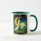 Mug in a woman in flowing white robes, with a flower in her hair, sitting gracefully on a golden crescent moon, surrounded by stars. Ornate Art Nouveau framing with flowers, and the word “VIRGO”, complete the celestial zodiac illustration.