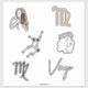 Virgo is represented in astrology as a beautiful maiden or virgin and shown here are symbols in a custom cut vinyl sticker page with six different images. Hand drawn colour and line ink drawings, symbols in black and gold, a black constellation of stars, and Virgo text in a fabulous handwritten font.