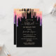 A girly and feminine 50th (or any age) virtual birthday party invitation. On front: A chic black background. Decorated with faux rainbow coloured glitter drips, paint dripping look in purple, pink and faux gold and rose gold. Personalize and add a name and party details. The name is written with a hand lettered style script, light rose gold coloured letters.