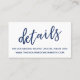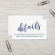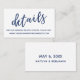 Gardez vos invités mariages dans la boucle avec tous vos détails avec ces jolies cartes d'insertion mariages modernes. Une superposition de texte décontractée a été conçue en utilisant une police manuscrite moderne en bleu marine, en lisant simplement "détails". Utilisez les champs modèles pour customiser ces cartes de boîtier avec vos informations personnelles. Une carte plus grande est également disponible dans l'ensemble, ce qui vous permet d'ajouter plus d'informations que ce que cette petite carte inclut. L'arrière - plan est blanc et cette couleur modifiable peut être changée en n'importe quoi de votre palette de mariages que vous choisissez ; tout texte modifiable apparaît dans la marine. // 90 //