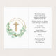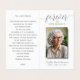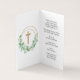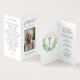 Une photo, les mots "Pour toujours dans nos coeurs", le nom et les dates sur le devant, la prière du Seigneur, ou toute prière, est présentée sur le dos avec des détails de la vie de votre être aimé à l'intérieur avec une élégante couronne d'eucalyptus et croix d'or. Beau à inclure à un enterrement, service commémoratif, anniversaire de mort ou dans des notes de remerciement.
