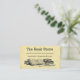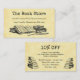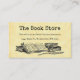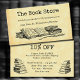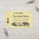 Une carte de coupon à rabais de librairie avec des lettres vintages et de la place pour vos infos à l'avant et à l'arrière, avec de l'art de vieux livres et une quill d'écriture sur l'avant et de vieilles piles de livres sur l'arrière, sur un arrière - plan faux parchemin.