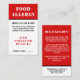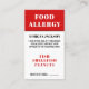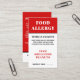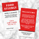 Carte d'alerte d'allergie alimentaire Verticale Rouge & Noir Contemporain. Conçue avec un look audacieux et classique, cette carte d'allergie alimentaire verticale combine des polices serif fortes avec une police sans serif propre pour un aspect poli et professionnel. L'avant est orné d'un arrière - plan noir frappant avec un texte blanc et clair et une mise en page facile à lire. En haut, "ALLERGIE ALIMENTAIRE" est affiché pour une visibilité immédiate. Ci-dessous, de l'espace est prévu pour ajouter votre nom et une liste des allergies alimentaires afin que le personnel puisse rapidement identifier ce qu'il faut éviter. Un espace dédié en bas permet au restaurant de noter son numéro de table, ce qui permet d'assurer un service soigné. Le dos comprend un message concis et respectueux au personnel de la cuisine sur la gravité de vos allergies, ainsi que l'espace pour un contact d'urgence. Entièrement personnalisable, cette carte garde la sécurité tout en maintenant une présentation raffinée, professionnelle et visuellement frappante.