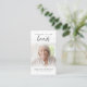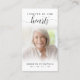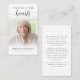 Funérailles Forever Hearts Script Carte de prière photo. Gardez la mémoire d'un être cher proche avec cette carte de prière personnalisée avec une photo chère, le titre FOREVER IN NOS COEURS, le nom et les dates et un message de souvenir chaleureux modifiable. Avec son design classique, simple mais élégant, noir et blanc et son script de calligraphie moderne et sophistiqué avec des swashes, il fait un souvenir significatif à partager à un enterrement, service commémoratif ou Célébration de la Vie et offre le confort et un hommage durable à la famille et aux amis. Sa petite taille portable de 3,5x2" (taille porte-monnaie) permet aux proches de la porter avec eux pour rappeler la vie et l’esprit de l’être aimé.