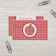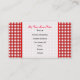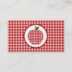 Un carte de visite comportant un arrière - plan rouge de guingan avec l'équilibre rose. Texte rouge et noir au-dessus de blanc pur. Personnalisez avec votre information. Caractéristiques de bord opposé assortissant l'arrière - plan de guingan. La pomme assortie de guingan à l'intérieur du cercle a formé le cadre rouge.