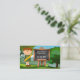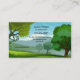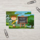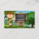 Un carte de visite fantaisiste mignon pour un professeur, avec une image de dessin animé avec un professeur et tableau noir avec pomme sur un arrière - plan de paysage vert.