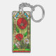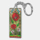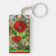 OEuvre d'art sophistiquée en vitrail avec une fleur rouge vif aux feuilles verts sur un arrière - plan bleu vif, orné d'éléments floraux complexes et de détails élégants qui exsument l'art et l'élégance.