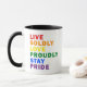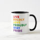 Live Boltly Love Fier Stay Pride Coffee Mug Design dans la typographie moderne qui dit "LIVE BOLDLY LOVE FIY STAY FIDE" dans un design minimaliste simple mais propre. Design simple dans les couleurs arc-en-ciel Pride qui fonctionne bien pour n'importe qui.