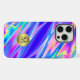 This colourful iPhone 15 Pro Max case features a very bright holographic design in shades of purple, blue, pink, green and aqua....in fact, all the colours you can imagine! It also features a customized monogram encircled inside a badge of gold. Make a chic statement with colour and originality, with our Vivid Holographic Monogrammed iPhone 15 Pro Max case, and make it an enviable part of your tech accessories.
