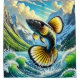 A vivid fish leaps from crashing waves against a dramatic mountain backdrop, its fins glowing in bright yellow and orange hues against deep blue water. The dynamic motion and bold colour contrasts create a striking, high-energy scene that blends natural power with artistic intensity.