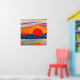Poster dans un coucher de soleil semi-abstrait sur l'océan derrière une chaîne de montagnes, aux couleurs psychédéliques de rouge et d'orange vif, avec montagnes bleu indigo foncé