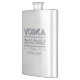 The product is a good size and came exactly as it was pictured. The lid is not attached to the flask, which could be dangerous on drunken nights... The print came out surprisingly well and looks very sharp. Would definitely recommend.
