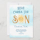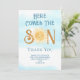 Le carte de remerciements de baby shower de ce mignon garçon comporte le texte "Here Comes The Son" en typographie rétro bleue avec un soleil aquarelle jaune, des nuages et un ciel bleu. Facile à personnaliser. Parce que nous créons notre oeuvre, vous ne trouverez pas cette image exacte d'autres designers. Aquarelle originale © Michele Davies.