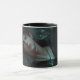A black ceramic mug, smooth and cold to the touch, adorned with an eerie design. Against the dark surface, a figure floats in an endless abyss, his body suspended in emptiness. His black, tousled hair frames sharp features, and his mismatched eyes—one orange, the other a mesmerizing blend of blue and green—seem to glow faintly in the void. A crimson trickle runs from his closed eyes and nose, adding an unsettling yet captivating touch to the artwork.