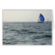 Une superbe voile bleue se détache sur un ciel et une eau du soir.