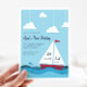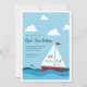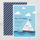 L'invitation à la fête d'anniversaires de enfants nautiques de charme présente un ciel bleu clair arrière - plan avec des nuages et des oiseaux de mer, et un voilier rouge naviguant sur mer calme. Personnalisez avec les détails de votre fête, avec la date et l'heure affichées sur les voiles du bateau. Les invitations se retournent vers la marine et les bandes blanches.