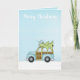 La voiture recouverte de bois se dirige vers la maison depuis le terrain de Noël. Il s'agit d'un design idéal pour toute salutation saisonnière ou transfert sur n'importe quel produit avec un arrière - plan bleu ciel et un sol recouvert de neige. Whimsical, coloré, design amusant pour tout le monde.