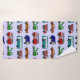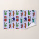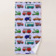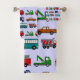 Ce kit de serviettes a un design novateur de camions et de bus en rouge, bleu, vert et marron sur un champ de bleu clair.