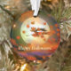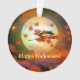 Accrocher l'ornement avec mon oeuvre originale de la silhouette d'une sorcière volant au-delà d'une éffrayante pleine lune la nuit d'Halloween, remuant les feuilles d'automne. Le texte personnalisable dit "Happy Halloween".
