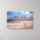 Impression paysage de toile d'un volcan enneigé avec un lac avec des flamants roses et un signe de danger dans le paysage désertique près de San Pedro de Atacama sur l'Altiplano à la frontière entre la Bolivie et le Chili.