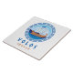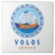 Volos, Greece ceramic tile with a design of an ancient Greek ship and Greek style lettering. This design features an Ancient Greece ship and the Greek key lines pattern in a circle design with the sea and sky.