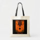 This Halloween tote bag features an abstract fractal design of a voodoo spirit in shades of red, black, green and blue. His horns are blue and he is surrounded by a brilliant orange gaseous cloud. The text reads: Trick or Treat. It can be customized or removed.