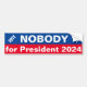 Don't like any of the candidates? Vote for Nobody for President. Nobody is just like all the other candidates, most likely he/she won't get anything done. But, at least they won't be arguing party sides and giving national addresses and making promises they can't keep. (No, we are not talking about Obama, Bush, Trump, etc.., we are just talking about Nobody.)