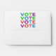 In the colours of dusty blue, green, red and purple, the word VOTE in large block letters. Share feelings on elections. Represents all parts of the political spectrum. Democrats, Green Party, Republicans and no party preference or independents can find a way to work together, too. Lots of colour for a bright and positive sounding message for get out the vote (GOTV). Envelopes help get your message across in snail mail.