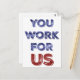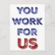 Vos dollars d'impôt paient leur salaire -- représentants de l'État, sénateurs américains, président et tous. Peut-être qu'ils pourraient utiliser un rappel ? Envoyez-leur un message sur cette carte postale de protestation patriotique VOUS TRAVAILLEZ POUR NOUS.