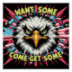 Un aigle féroce avec une toile de fond colorée et audacieuse est encadré par les mots "VOUS VOULEZ QUE CERTAINS VIENNENT EN OBTENIR." Des formes dynamiques et des couleurs vives créent un impact visuel intense et énergique.