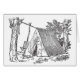 Croquis vintage de la tente de toile de base supportée par la ficelle de corde entre deux arbres