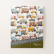 Vroom! Vroom! Your little boy will love this adorable custom car pattern with its own road! Jigsaw puzzle has a bus, taxi cab, garbage recycling truck, construction vehicles, tow truck, and more. There is also a road and a green corner for your little one's first name. This puzzle would make an adorable addition to your young kid's game collection in a bedroom or nursery.