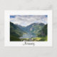 Carte postale du fameux fjord Geirangerfjord, paquebot de croisière et village de Geiranger entre les montagnes de Norvège avec une frontière blanche et le texte : "Norvège".