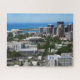 Puzzle. Une vue panoramique sur le centre-ville d'Honolulu Hawaii sous un ciel bleu clair présente un mélange de gratte-ciel hauts et de bâtiments plus petits. Au loin, l'océan bleu et calme se profile à l'horizon, offrant un cadre tranquille à l'environnement urbain.