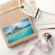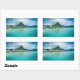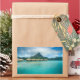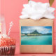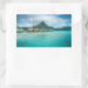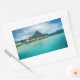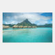 Photo souvenir rectangulaire autocollant d'un luxueux complexe de bungalows au toit de chaume surplombant l'eau dans une station balnéaire au bord d'un lagon bleu clair avec vue sur l'île tropicale de Bora Bora, près de Tahiti, en Polynésie française.