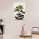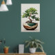 Wabi-Sabi art of a potted bonsai tree with vibrant green leaves and a twisted trunk is depicted with a high level of detail. The pot features a swirling, multi-coloured design that complements the organic shape of the tree.