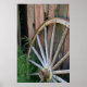 An old wagon wheel sits next to a weathered barn with a touch of green grass for colour.